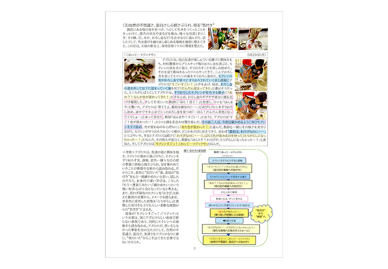 6面記事 4歳児5月下旬の「これって…マジックや」の実践事例紹介。中央に保育者が書いたエピソードがあり、色分けによる分析が行われたことが分かる 京都市立幼稚園エピソード研修会 下 子どもたちの保育記録を基に保…
