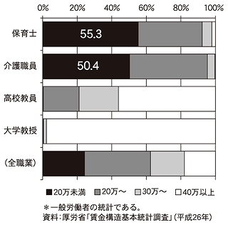 11面記事 ツイッターなどのSNSで、自身の薄給を暴露する保育士を見掛けるが、その生々しい声を官庁統計で集計すると、右のグラフのようになる。保育士は、半分以上が月収20万未満である。 人の命を預かり、かつ人生…