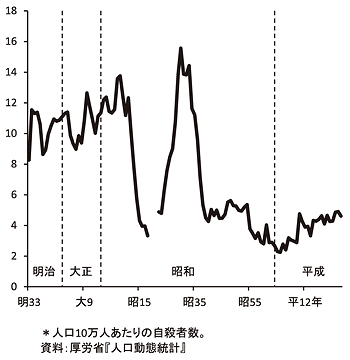 夏休み明けの9月1日に子どもの自殺が最多であることが分かり、大きな関心を集めた。自殺率は人間の「生きづらさ」の程度を表す指標だが、10代少年の自殺率の長期推移をたどると右のグラフのようになる。 子…