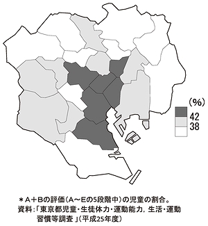14面記事 東京都は独自の体力テストの結果を地域別に公表している。それを地図にすると意外な事実が出てくる。 右図によると、小学校4年生(10歳児)の体力は都心で高く、周辺部で低い。都心では遊び場が少なく、体育…
