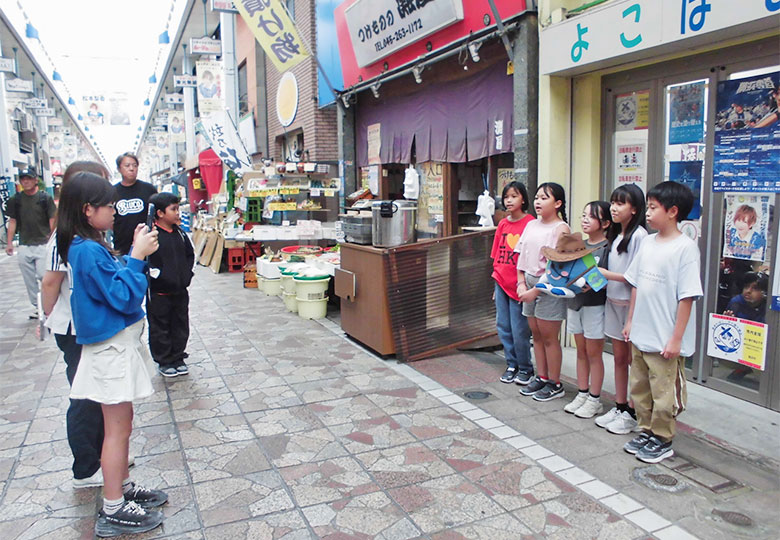 商店街で動画を撮影する子どもたち 横浜市立南吉田小4年生 外国にルーツを持つ子どもたちが多いことで知られる横浜市立南吉田小学校(金子正人校長、児童581人)。本年度は4年生が総合的な学習の時間で、学…