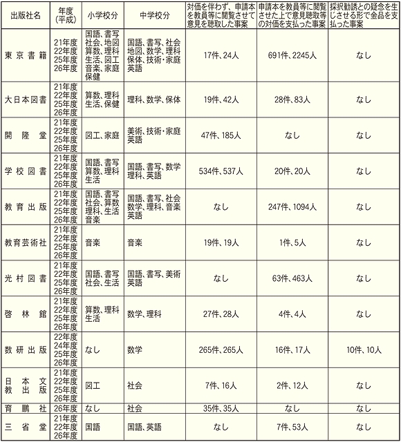 文科省まとめ 文科省は1月22日に、小・中学校など義務教育諸学校で使用する教科書を発行している出版社が禁止事項を破って採択前に発行予定の教科書を見せるなどしていた問題を受けて各出版社による自己点検・…