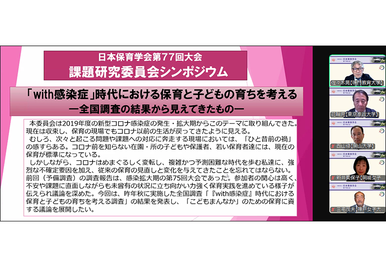 課題研究委員会シンポジウムの画面 日本保育学会第77回大会 (上) 一般社団法人日本保育学会は5月11、12の両日、第77回大会(担当校=神戸大学)を開催した。4年続けてのオンライン開催。大会テーマ…