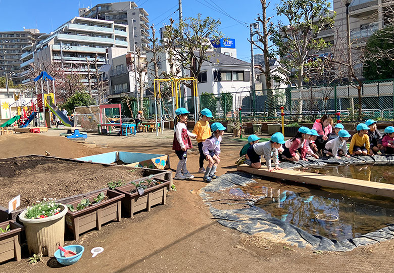 土山を移動して畑を作り、「おさかな池」を構築した現在の園庭 東京・江東区立なでしこ幼稚園 (上) 豊かな園庭環境は、子どもたちが経験できることが増えて遊びが充実し、たくさんの学びにつながっていく。東…