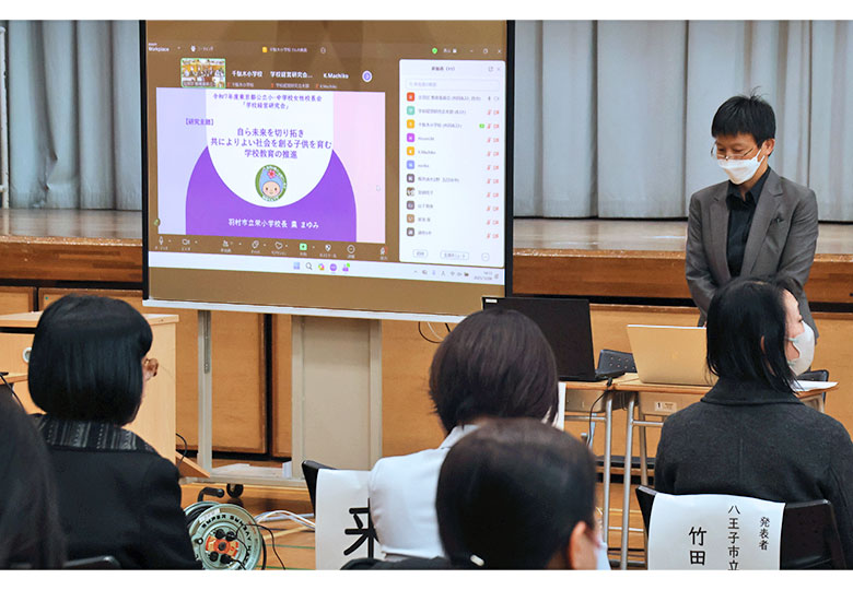 「誰一人取り残さない」ための考え方や取り組みを紹介する棗校長(右奥) 東京都公立小・中学校女性校長会(会長=古矢美雪・東久留米市立第五小学校校長)は昨年12月6日、文京区立千駄木小学校で「学校経営研…