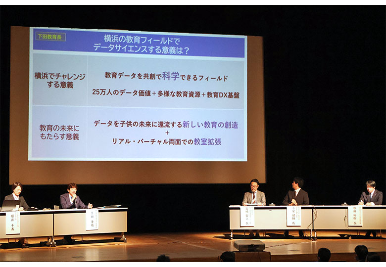 2面記事 報告会の最後には、下田康晴教育長(左から2人目)も登壇した 横浜市は19日、全ての市立学校にデジタル図書館を導入した成果や、ICTを活用したメンタルケア体制を紹介する報告会を実施した。企業や大学の関…