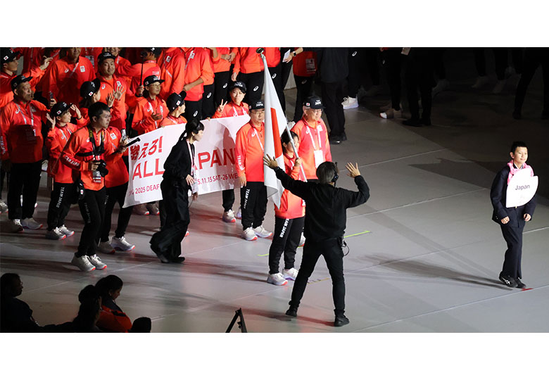 大会メインカラーの桜色のスカーフを着用し、日本選手団と共に入場する生徒(右端) 開催中の東京デフリンピックでは、主会場がある東京の児童・生徒が観戦に赴くなど、障害者スポーツを身近に感じる機会となって…