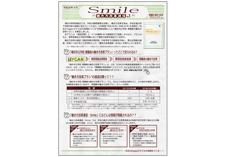 関東版 横浜市教委の「働き方改革通信 Smile」とは 横浜市教委では、平成25年度に実施した「横浜市立学校、教職員の業務実態に関する調査」をきっかけとし、教職員の負担軽減に関する取組を進めて来たが、長時間…