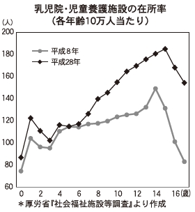 保護者のいない孤児、保護者に養育させるのが適当でない子どもは施設に入所する。1歳未満は乳児院、それ以外の児童・生徒は養護施設だ。 これらの施設に在所している児童・生徒は、平成28年10月時点で2万…