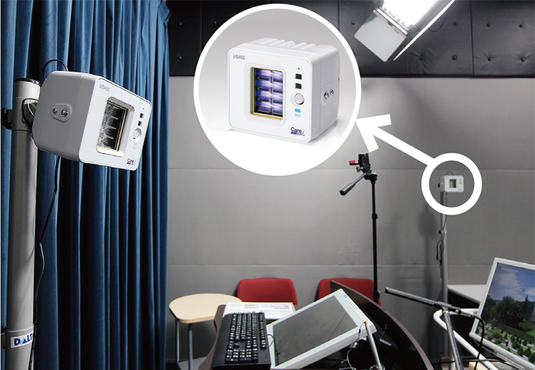 収録スタジオに設置された紫外線照射装置「Care222(R) iシリーズ」 モノと空気を同時に除菌する「Care222(R) iシリーズ」 明治大学 新型コロナウイルスをはじめとした除菌対策では、密…