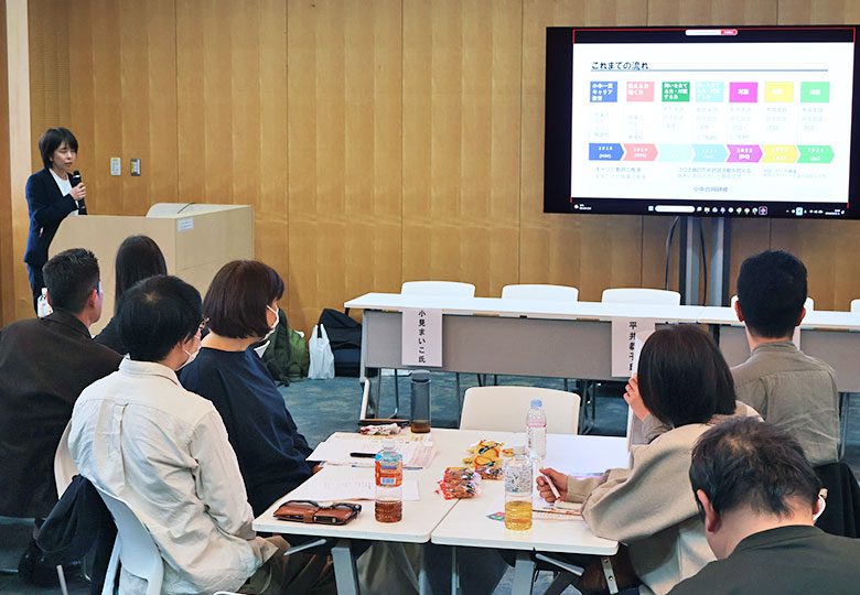 ファシリテーションを導入し、その取り組みの流れを時系列で説明する松田主幹教諭(左奥) 日本ヒューマンケアリング教育学会が教育フォーラム初開催 日本ヒューマンケアリング教育学会(代表理事=岩崎保之・関…