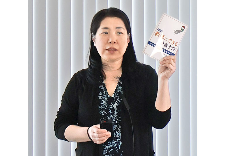 講演中、著書の「教師にできる自殺予防」を紹介する高橋さん 1日に始まった自殺対策強化月間を前に、日本いのちの教育学会が第27回研究大会を開いた。SOSの出し方を児童・生徒に教えるなどしてきた高橋聡美…
